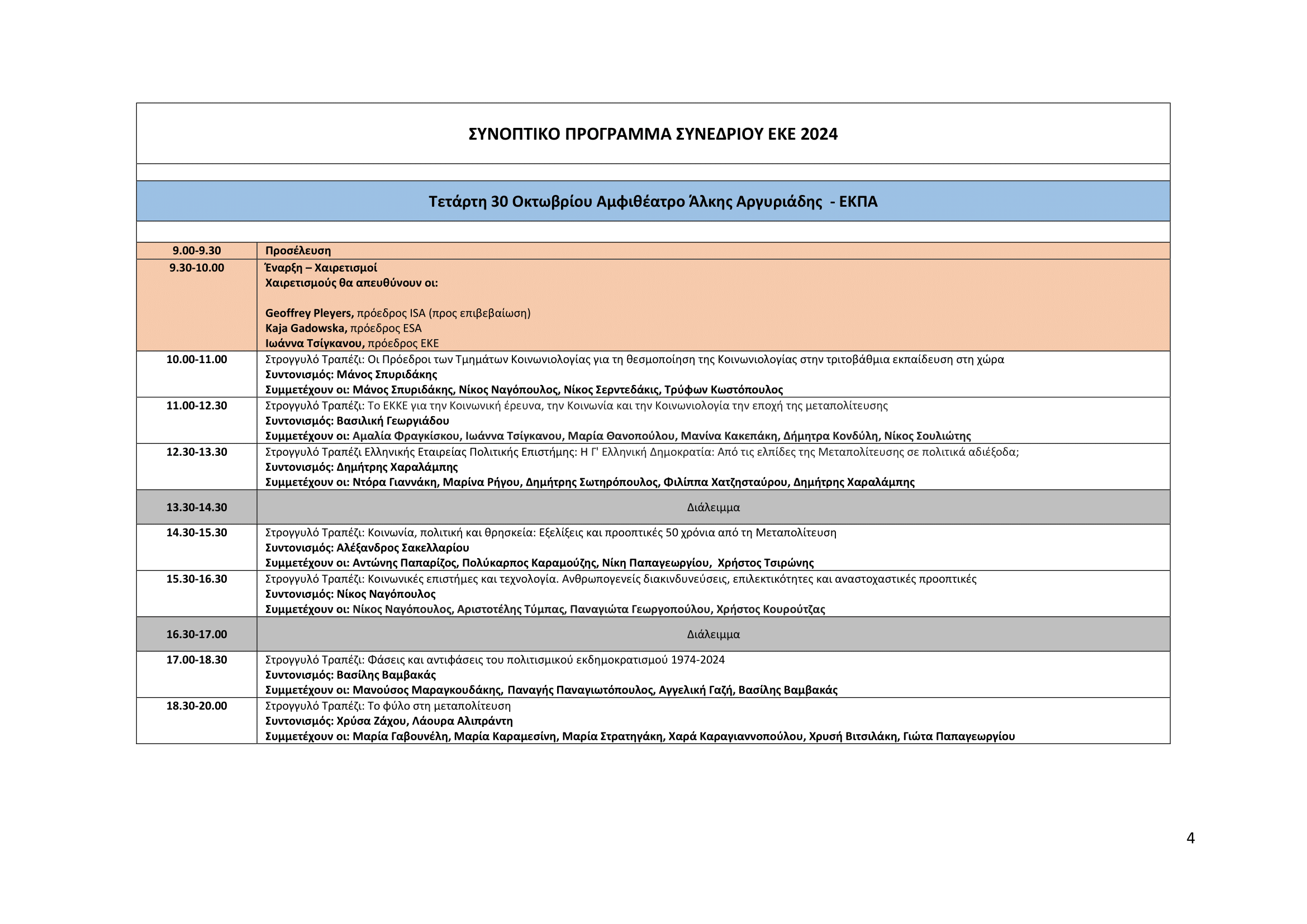 Η Ελληνική Κοινωνιολογική Εταιρεία, το τμήμα Κοινωνιολογίας του Εθνικού και Καποδιστριακού Πανεπιστημίου Αθηνών και το Εθνικό Κέντρο Κοινωνικών Ερευνών σας προσκαλούν να παρακολουθήσετε το 9ο Τακτικό Συνέδριο της ΕΚΕ με τίτλο «1974 – 2024 Κοινωνία και Κοινωνιολογία στην Ελλάδα πενήντα χρόνια από την αποκατάσταση της δημοκρατίας».
